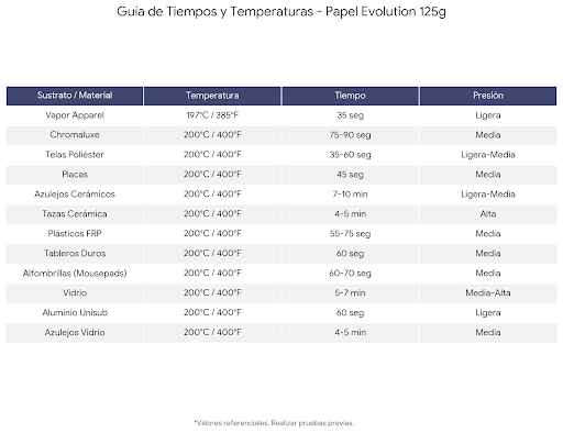 - Sustratos Rígidos: Generalmente se recomienda una temperatura de transferencia de aprox. 190 o 200º según tabla detallada),ajustando tiempo y presión según el objeto